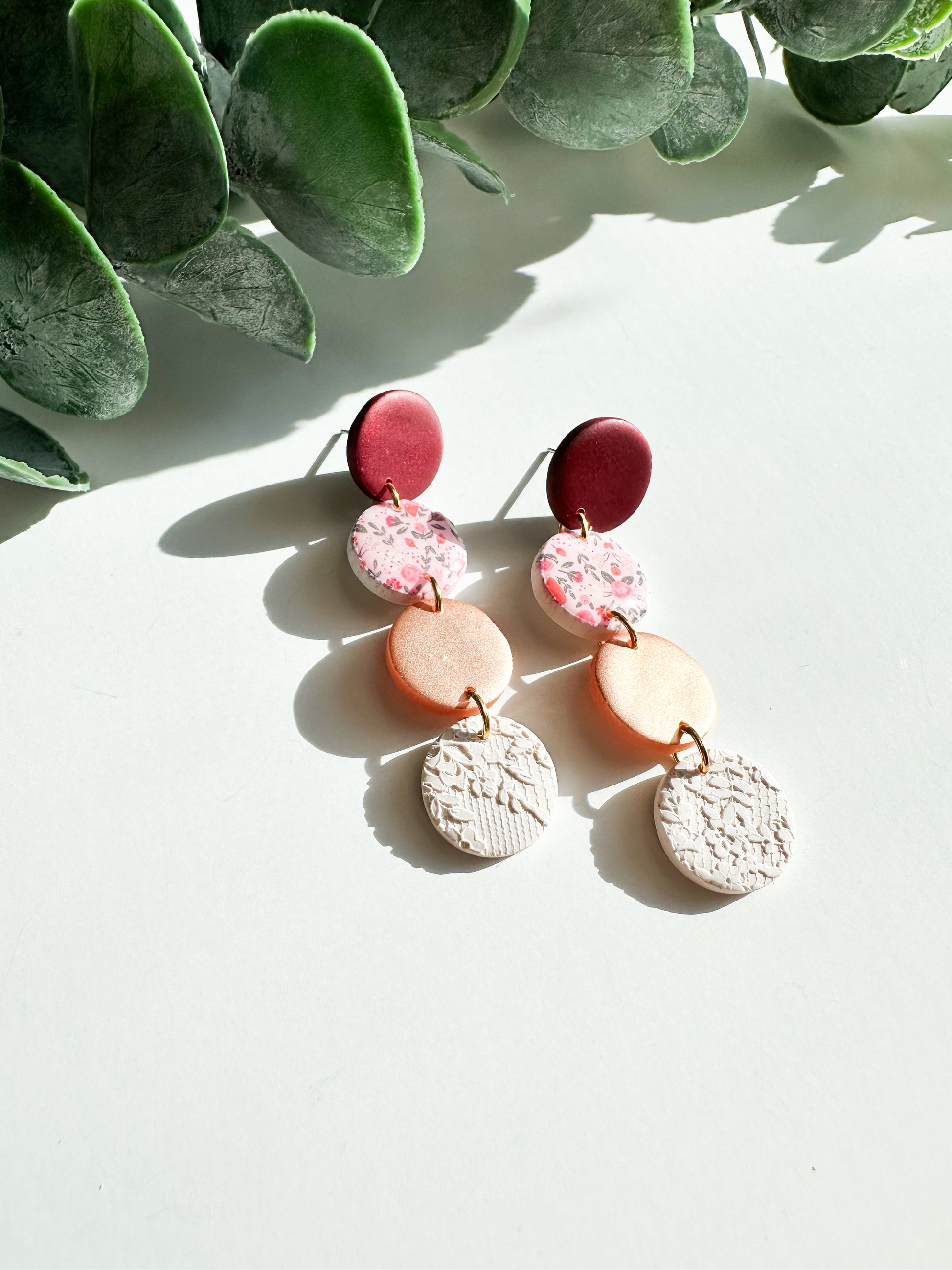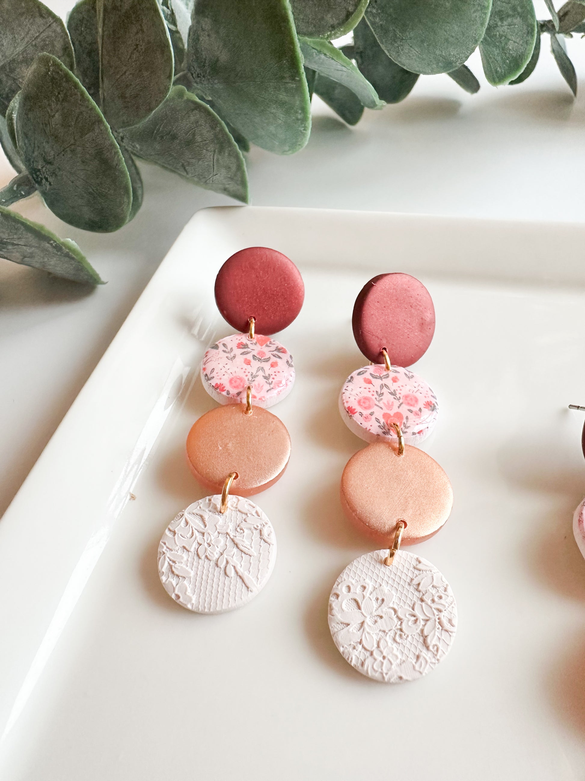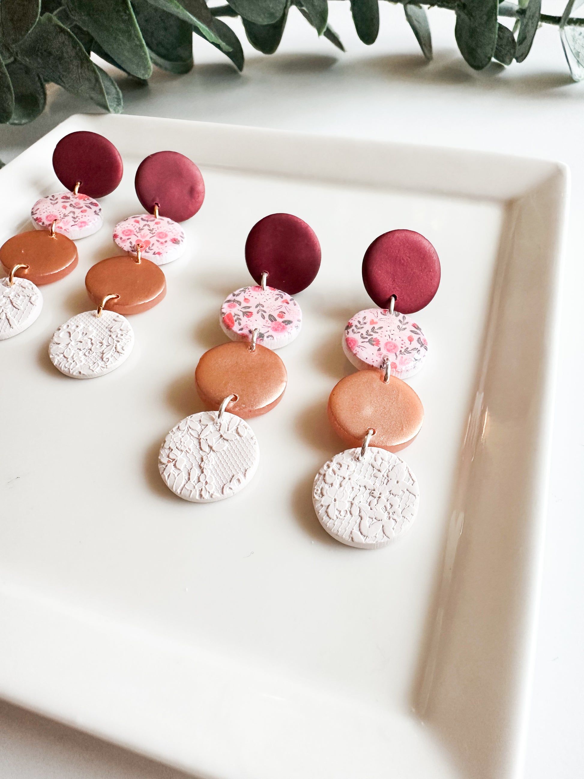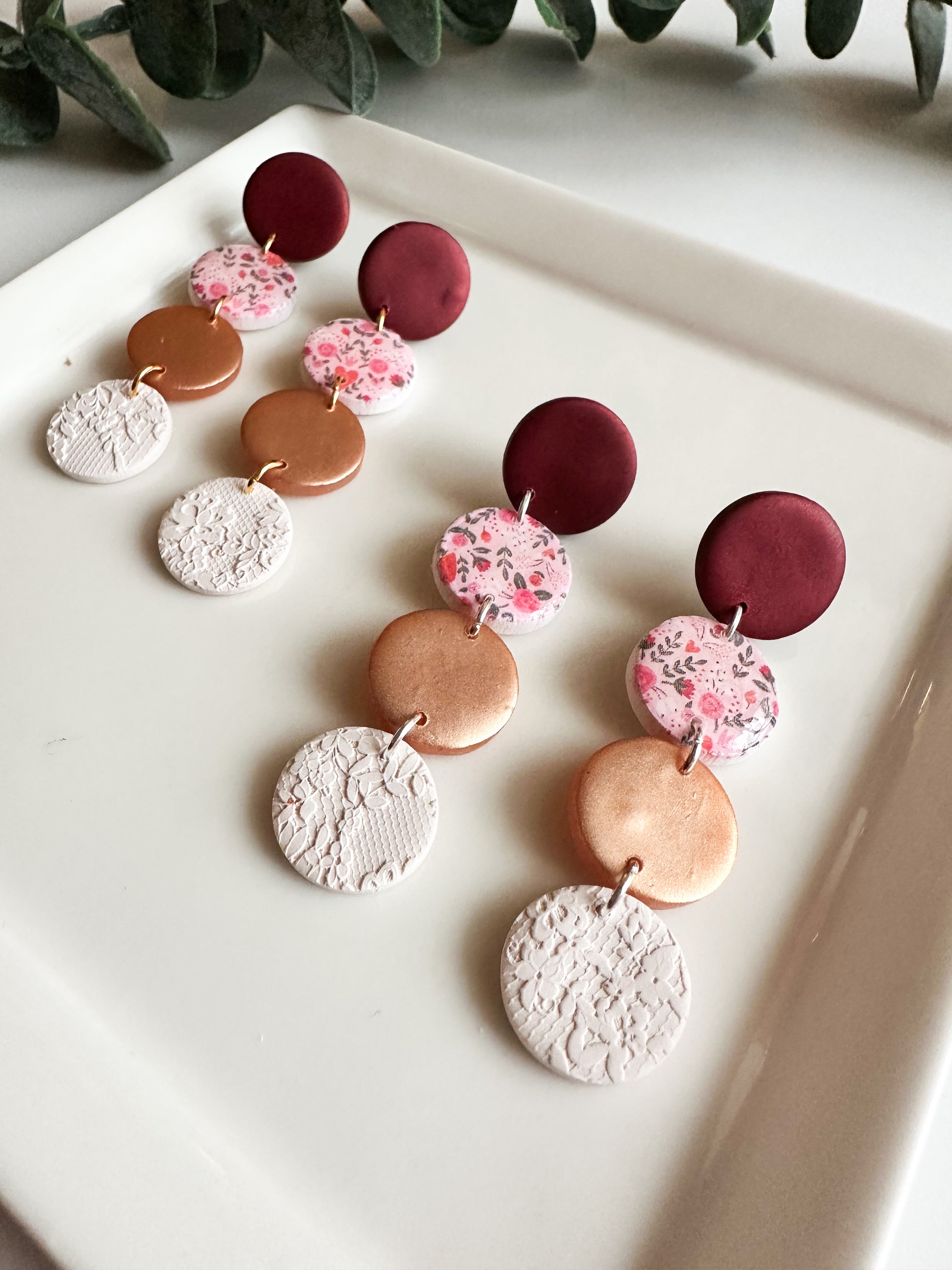 Valentines dangles with simmer maroon, bronze, floral and cream lace layers.